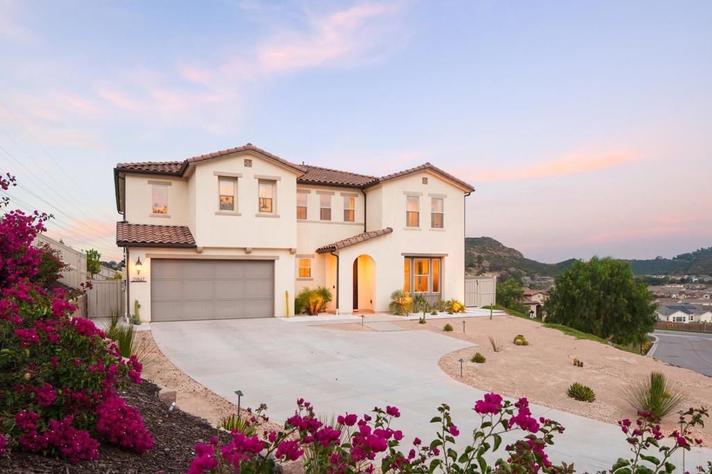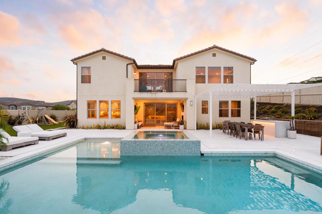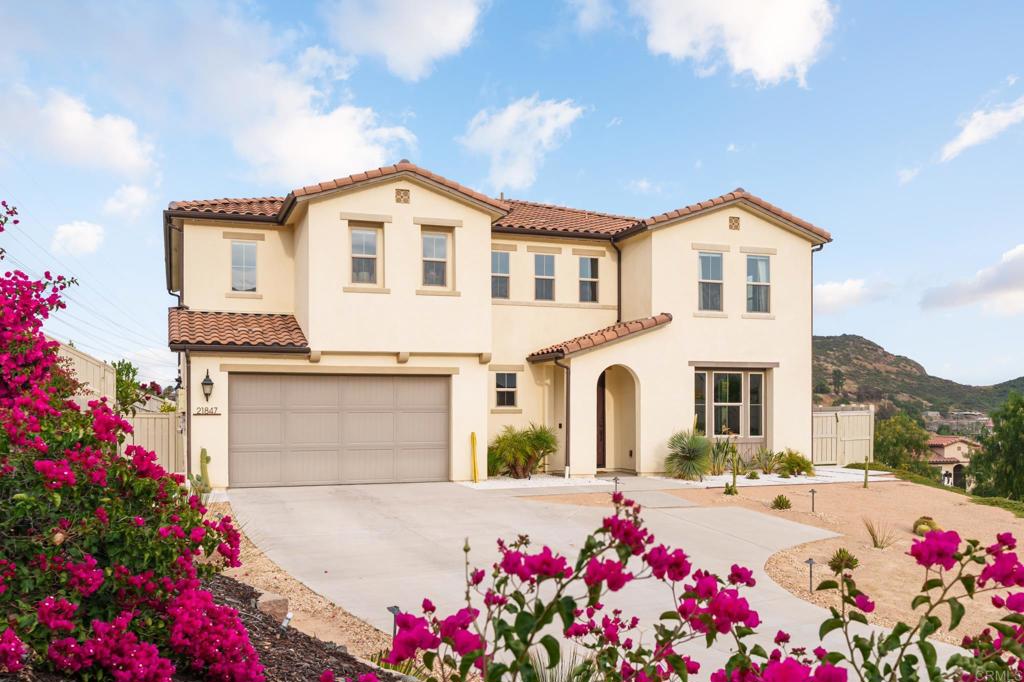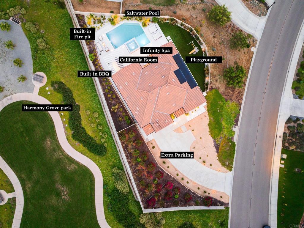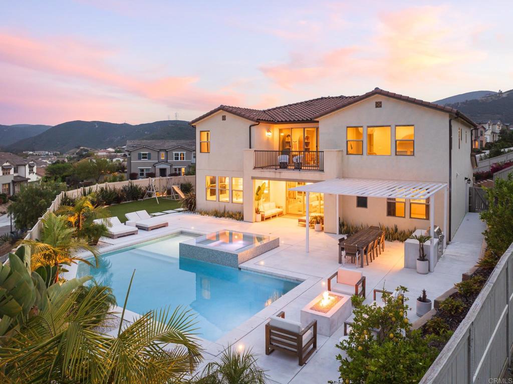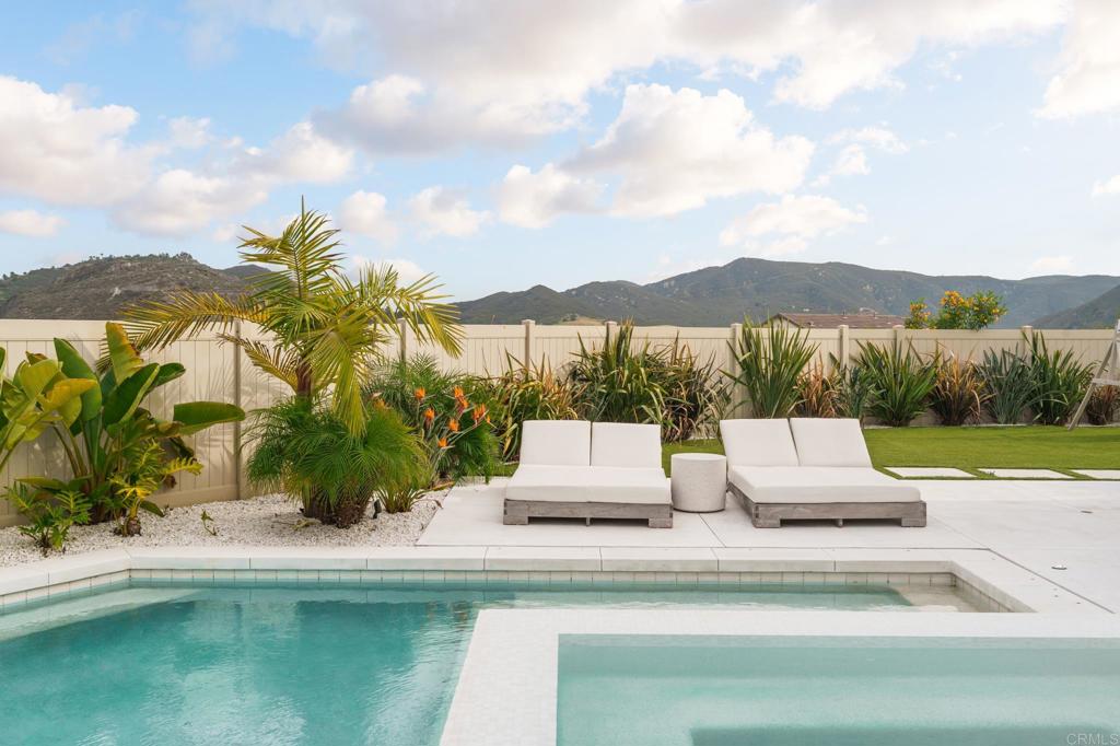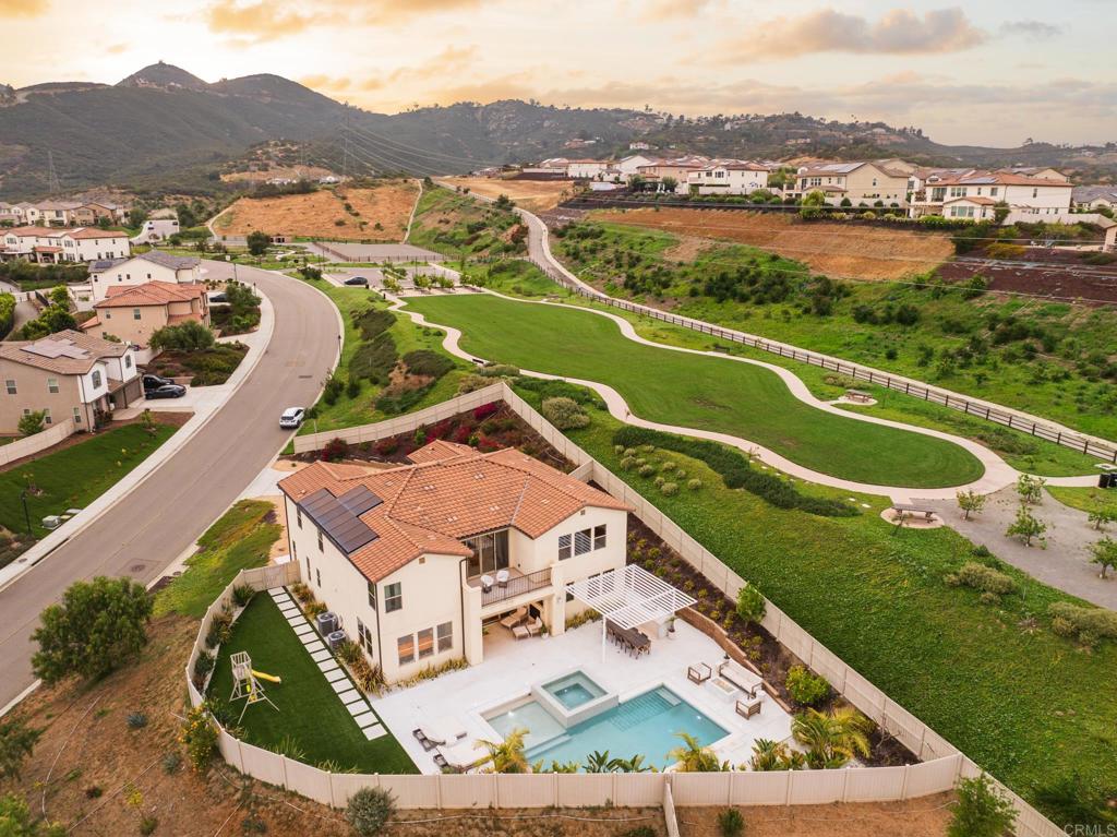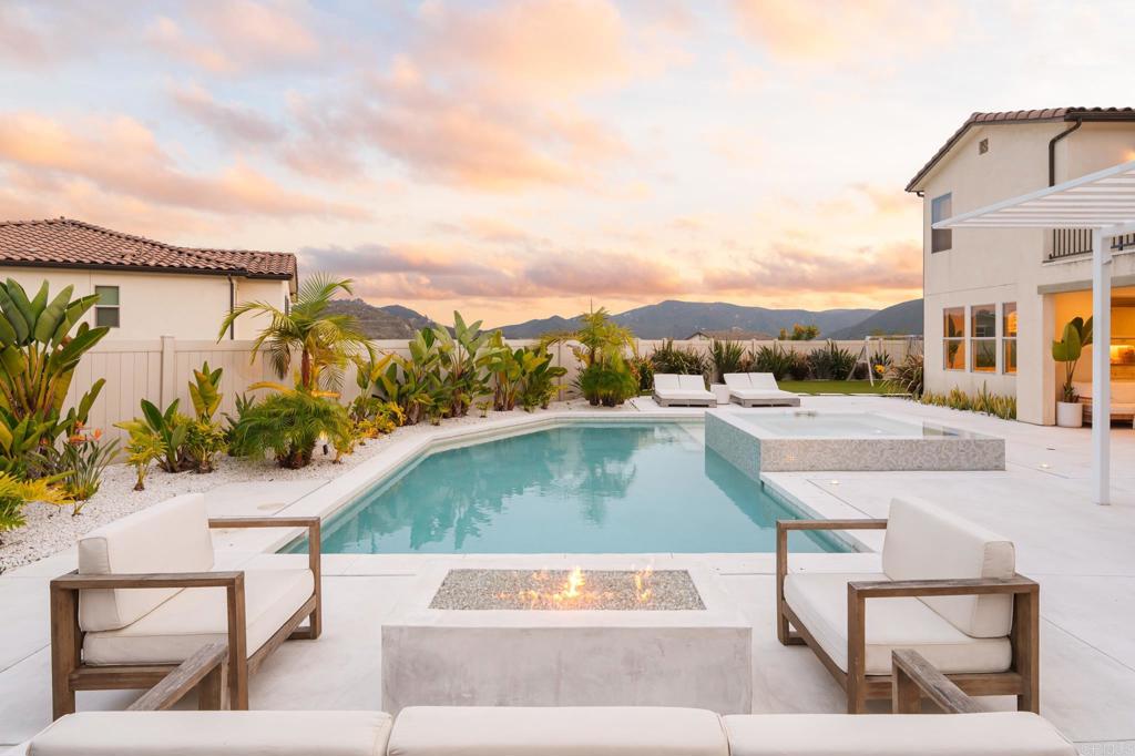 Gorgeous, newer home with modern resort-style yard! Set on a private, elevated 1/3 acre lot with sweeping mountain views, this exceptional property offers refined living in the coveted Whittingham neighborhood of Harmony Grove Village. With a long driveway, adjacent park, and added privacy, this home stands out! Built in 2020 and upgraded throughout, the expansive 3,778 sq ft floor plan features 5 bedrooms, 4.5 baths, including a desirable first-floor bedroom suite plus an additional guest powder room. The open-concept great room is the heart of the home, showcasing luxury vinyl plank flooring and seamless indoor-outdoor flow with sliding glass pocket doors. The covered California room is designed for year-round enjoyment with a fireplace, TV, and ceiling fan, opening to a true entertainer's backyard. The chef's kitchen is beautiful with a large quartz center island, designer pendants, GE Profile appliances, custom backsplash and generous walk-in pantry all opening to the main living and dining areas. Upstairs, there are four bedrooms, three bathrooms plus a spacious bonus room that offers endless flexibility as a media room, playroom, or retreat with a private view balcony. The primary suite is a true sanctuary, featuring a spa-inspired bathroom with a soaking tub, walk-in shower, and refined finishes as well as an luxurious walk-in closet. Step outside to your own private resort: a sparkling pool with Baja shelf and oversized infinity edged spa, built-in BBQ, fire pit, and large side yard with turf, all designed to maximize privacy and views. Additional highlights include owned solar, a 3-car tandem garage, dual A/C, upstairs laundry room with sink and cabinetry, and a tankless water heater. The yard features low maintenance landscaping with lighting as well as citrus and avocado trees. Residents of Harmony Grove Village enjoy access to The Grove clubhouse with pool, spa, wading pool, BBQ areas, shaded lounges, playgrounds, parks, dog park, and miles of scenic trails, all within a vibrant master-planned community known for its natural beauty and lifestyle amenities. Tucked into the rolling hills of Escondido's Harmony Grove, just minutes to shopping, dining, hiking and equestrian trails with easy access to coastal amenities, beaches, and major freeways. Turn-key, stylish, and ideally located!