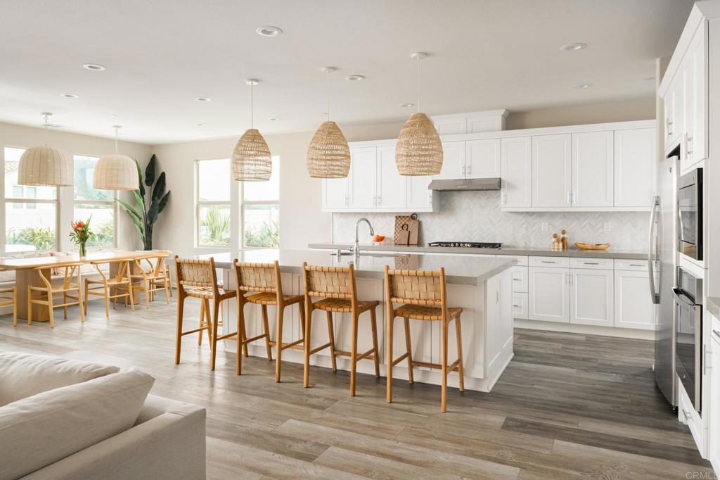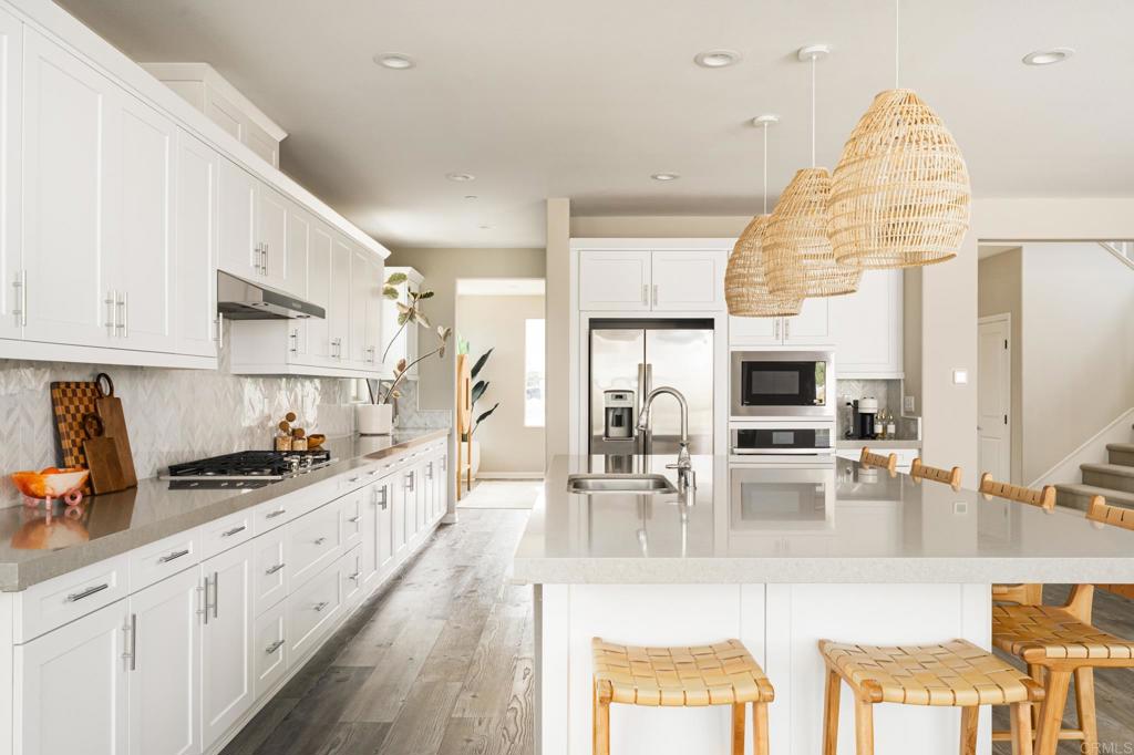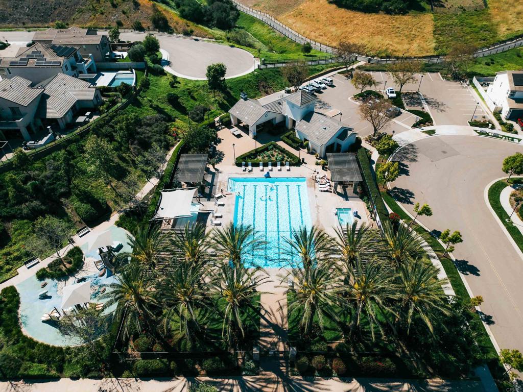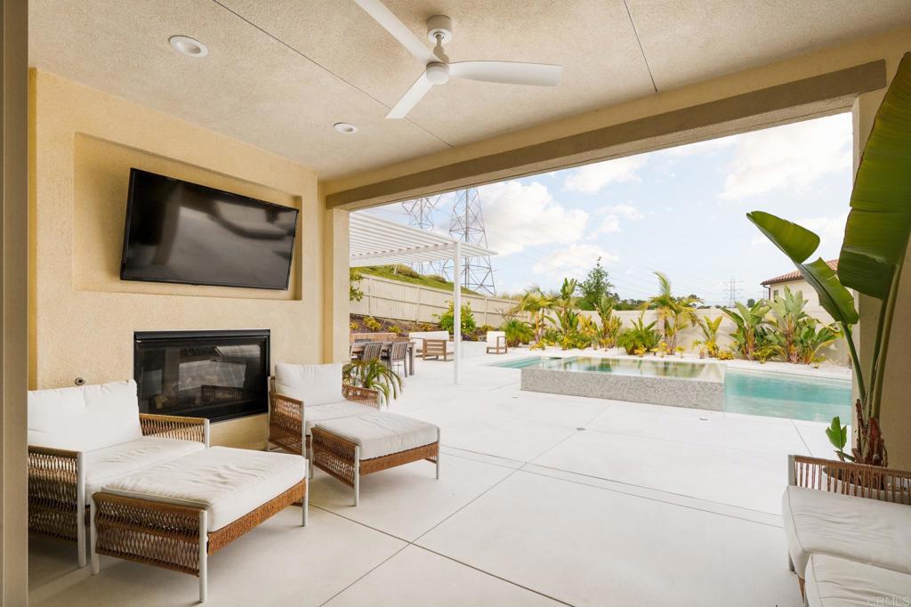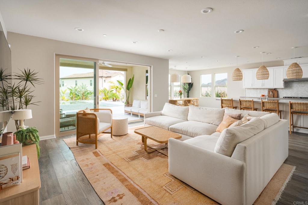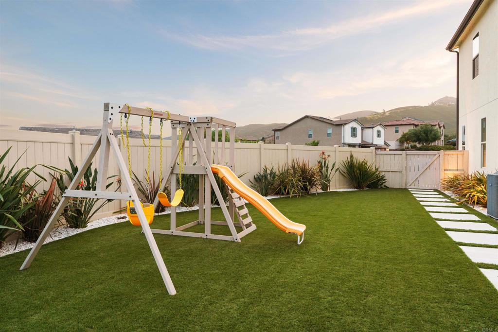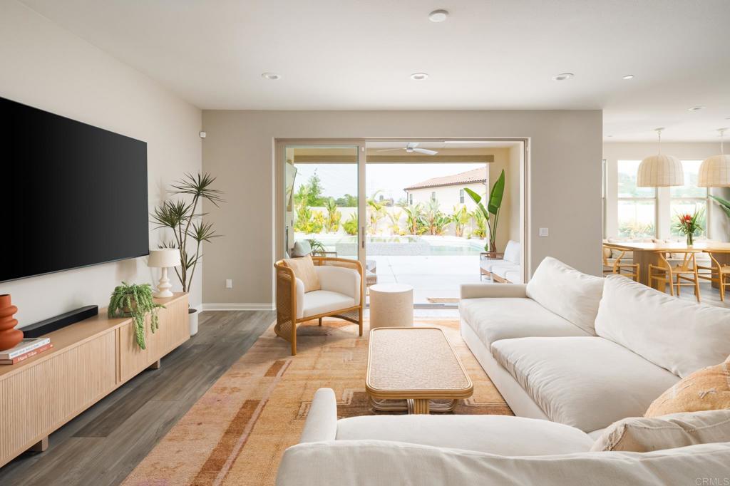 Gorgeous, newer home with modern resort-style yard! Set on a private, elevated 1/3 acre lot with sweeping mountain views, this exceptional property offers refined living in the coveted Whittingham neighborhood of Harmony Grove Village. With a long driveway, adjacent park, and added privacy, this home stands out! Built in 2020 and upgraded throughout, the expansive 3,778 sq ft floor plan features 5 bedrooms, 4.5 baths, including a desirable first-floor bedroom suite plus an additional guest powder room. The open-concept great room is the heart of the home, showcasing luxury vinyl plank flooring and seamless indoor-outdoor flow with sliding glass pocket doors. The covered California room is designed for year-round enjoyment with a fireplace, TV, and ceiling fan, opening to a true entertainer's backyard. The chef's kitchen is beautiful with a large quartz center island, designer pendants, GE Profile appliances, custom backsplash and generous walk-in pantry all opening to the main living and dining areas. Upstairs, there are four bedrooms, three bathrooms plus a spacious bonus room that offers endless flexibility as a media room, playroom, or retreat with a private view balcony. The primary suite is a true sanctuary, featuring a spa-inspired bathroom with a soaking tub, walk-in shower, and refined finishes as well as an luxurious walk-in closet. Step outside to your own private resort: a sparkling pool with Baja shelf and oversized infinity edged spa, built-in BBQ, fire pit, and large side yard with turf, all designed to maximize privacy and views. Additional highlights include owned solar, a 3-car tandem garage, dual A/C, upstairs laundry room with sink and cabinetry, and a tankless water heater. The yard features low maintenance landscaping with lighting as well as citrus and avocado trees. Residents of Harmony Grove Village enjoy access to The Grove clubhouse with pool, spa, wading pool, BBQ areas, shaded lounges, playgrounds, parks, dog park, and miles of scenic trails, all within a vibrant master-planned community known for its natural beauty and lifestyle amenities. Tucked into the rolling hills of Escondido's Harmony Grove, just minutes to shopping, dining, hiking and equestrian trails with easy access to coastal amenities, beaches, and major freeways. Turn-key, stylish, and ideally located!