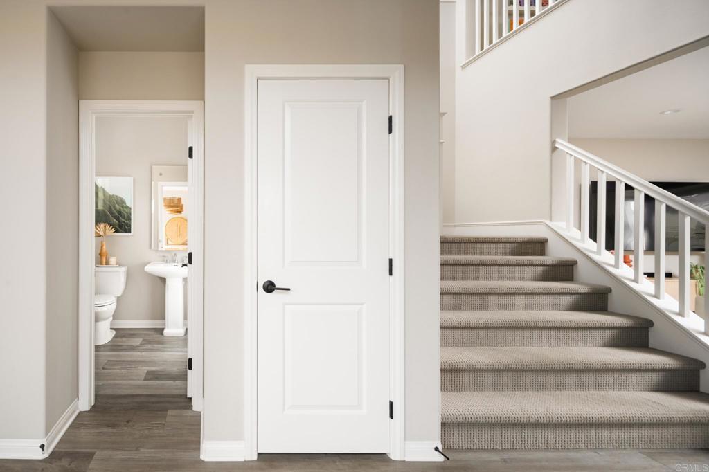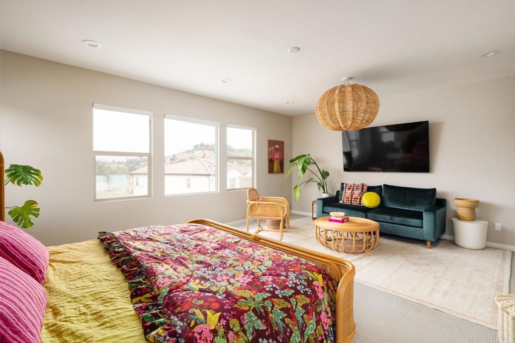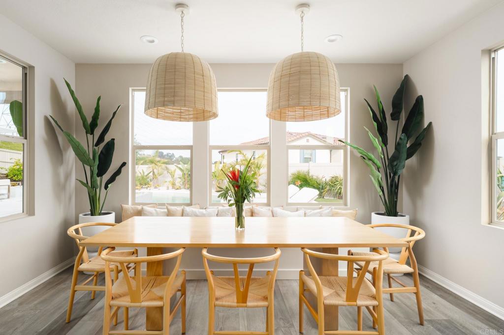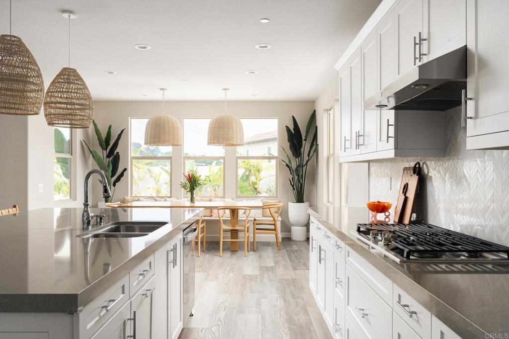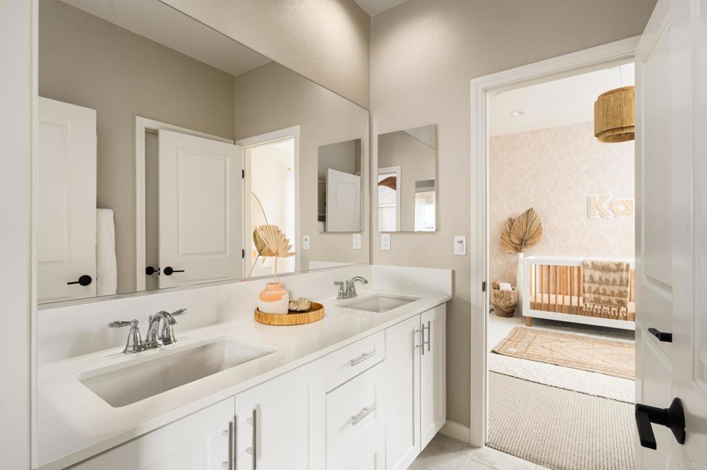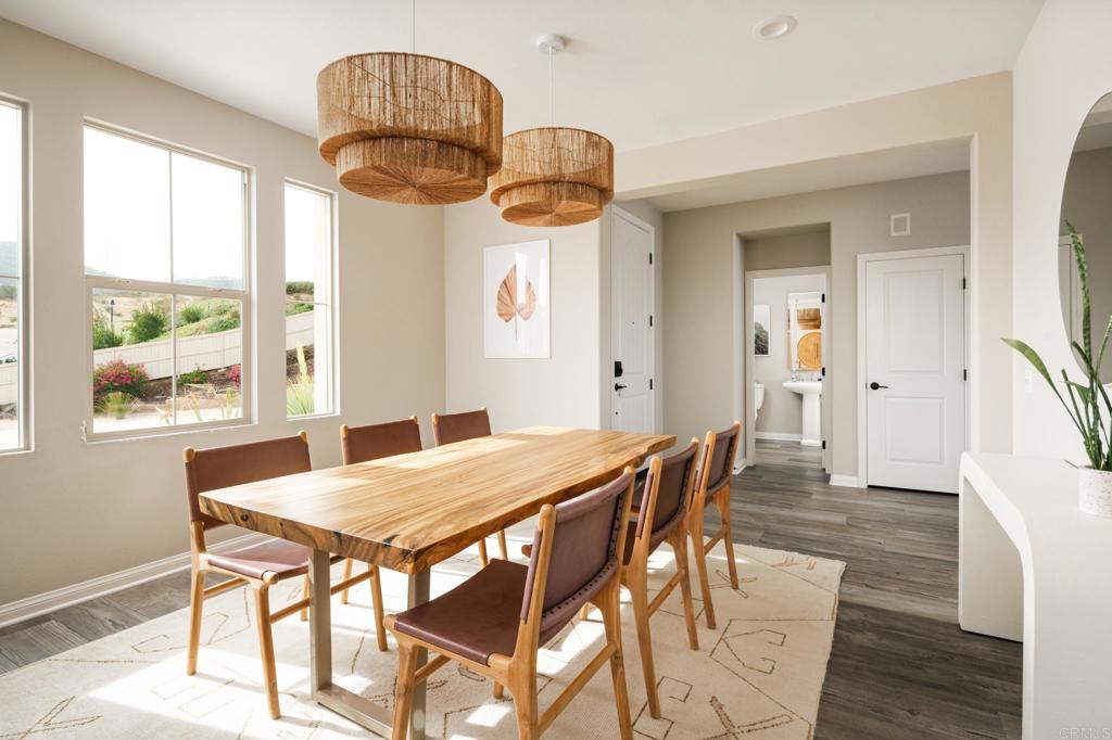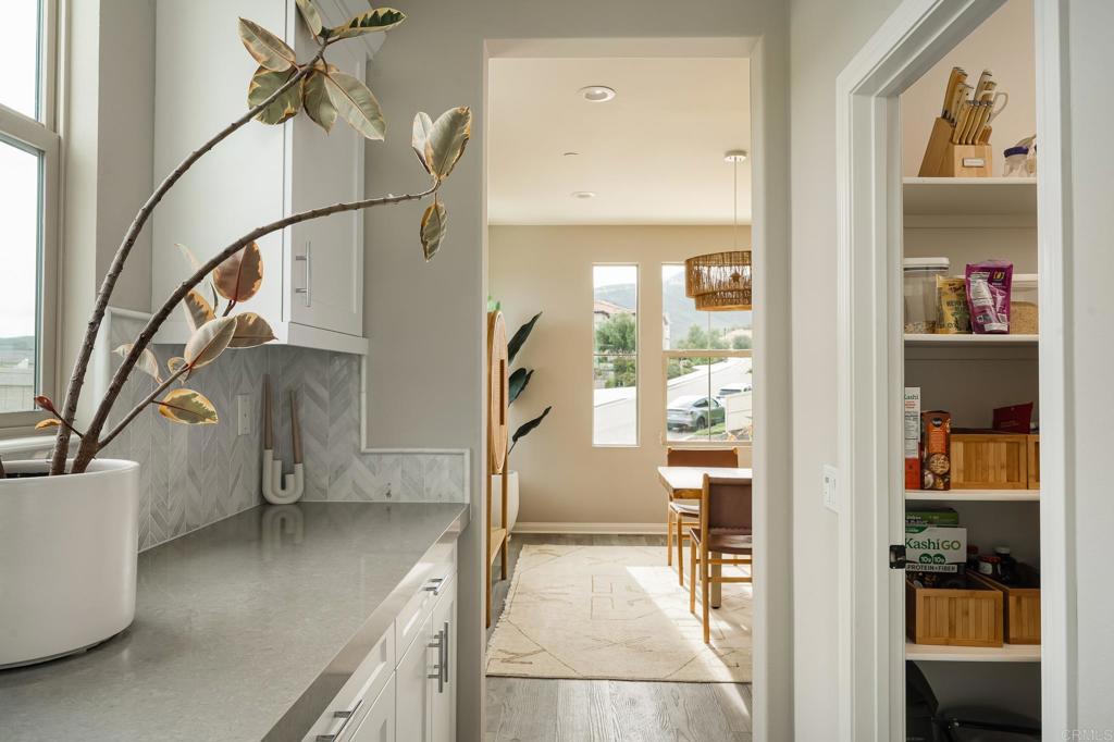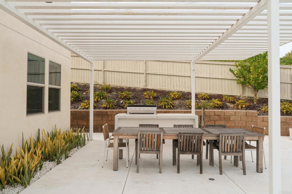 Gorgeous, newer home with modern resort-style yard! Set on a private, elevated 1/3 acre lot with sweeping mountain views, this exceptional property offers refined living in the coveted Whittingham neighborhood of Harmony Grove Village. With a long driveway, adjacent park, and added privacy, this home stands out! Built in 2020 and upgraded throughout, the expansive 3,778 sq ft floor plan features 5 bedrooms, 4.5 baths, including a desirable first-floor bedroom suite plus an additional guest powder room. The open-concept great room is the heart of the home, showcasing luxury vinyl plank flooring and seamless indoor-outdoor flow with sliding glass pocket doors. The covered California room is designed for year-round enjoyment with a fireplace, TV, and ceiling fan, opening to a true entertainer's backyard. The chef's kitchen is beautiful with a large quartz center island, designer pendants, GE Profile appliances, custom backsplash and generous walk-in pantry all opening to the main living and dining areas. Upstairs, there are four bedrooms, three bathrooms plus a spacious bonus room that offers endless flexibility as a media room, playroom, or retreat with a private view balcony. The primary suite is a true sanctuary, featuring a spa-inspired bathroom with a soaking tub, walk-in shower, and refined finishes as well as an luxurious walk-in closet. Step outside to your own private resort: a sparkling pool with Baja shelf and oversized infinity edged spa, built-in BBQ, fire pit, and large side yard with turf, all designed to maximize privacy and views. Additional highlights include owned solar, a 3-car tandem garage, dual A/C, upstairs laundry room with sink and cabinetry, and a tankless water heater. The yard features low maintenance landscaping with lighting as well as citrus and avocado trees. Residents of Harmony Grove Village enjoy access to The Grove clubhouse with pool, spa, wading pool, BBQ areas, shaded lounges, playgrounds, parks, dog park, and miles of scenic trails, all within a vibrant master-planned community known for its natural beauty and lifestyle amenities. Tucked into the rolling hills of Escondido's Harmony Grove, just minutes to shopping, dining, hiking and equestrian trails with easy access to coastal amenities, beaches, and major freeways. Turn-key, stylish, and ideally located!